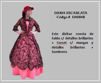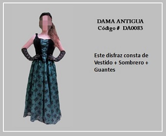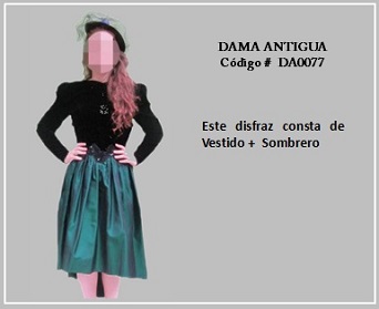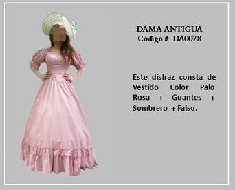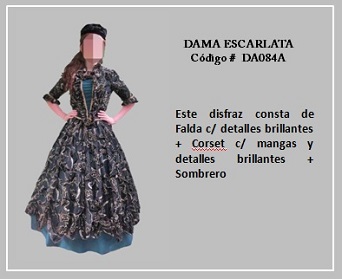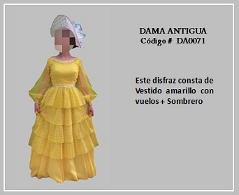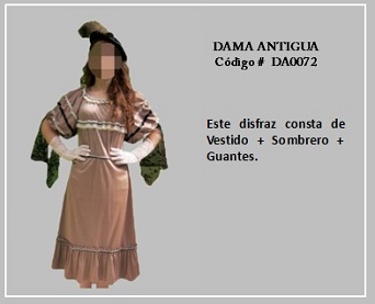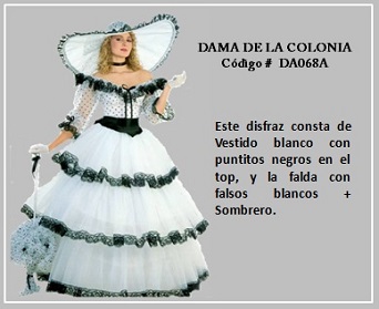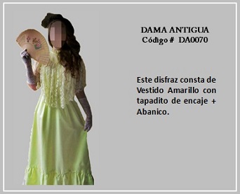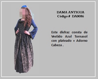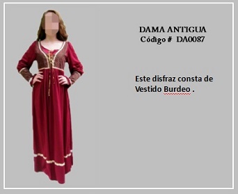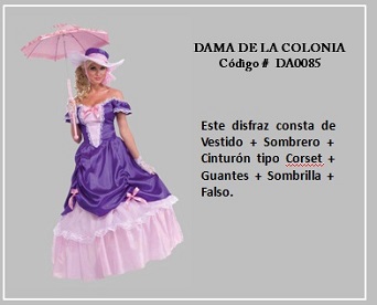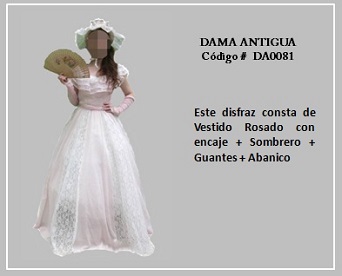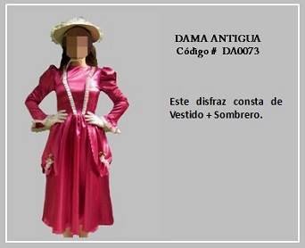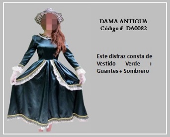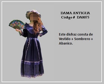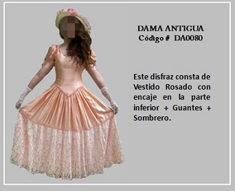 Los trajes de damas antiguas tradicionales de los diferentes países y regiones del mundo son muy variados y representan distintas culturas y condiciones de cada época. En tal sentido, hay cientos de ellos en todo el mundo. A modo de ejemplo, la moda de la época georgiana, abarca el período comprendido entre 1714 y 1811, y se distingue por la extravagancia de los vestido que llevaban las damas. Durante la época colonial las mujeres llevaban el pelo en un peinado alto y vestían según sus marcadas clases sociales: la aristocracia llevaba finos vestidos mientras que el resto de las mujeres lucían faldas largas con camisas blancas y un delantal. A continuación se presentan algunos disfraces que representan algunas características de épocas pasadas. Para ver un disfraz haga clic en la diapositiva y, si necesita ver las demás repita el clic en las flechas para avanzar (derecha) o retroceder (izquierda). Para volver al menú de la página haz clic en la X ubicada en la esquina superior derecha.