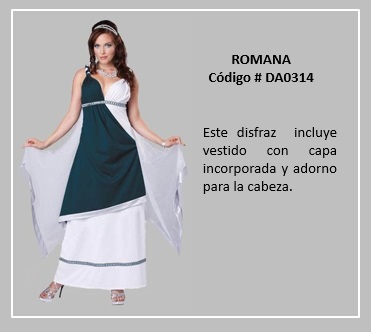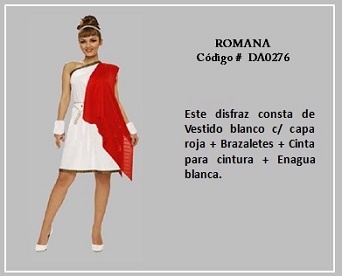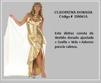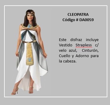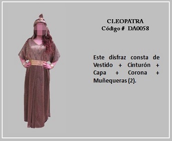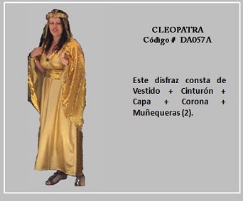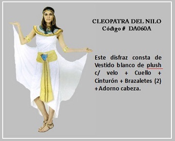 Al hablar de las mujeres de Egipto, sin duda Cleopatra, que fue el último faraón egipcio, es la reina que se ha transformado en todo un icono, por tanto, ella representa lo más típico del vestuario en el reino de Egipto. Por otro lado, la prenda más común usada por los antiguos romanos y griegos, tanto por los hombres como las mujeres, era la túnica. Esta consistía en un chitón, que era una túnica larga que, a veces llegaba hasta los tobillos, esta se ajustaba a la cintura con un cinturón y se prendía con broches en los hombros. La población con mayores recursos monetarios solía ponerse encima una toga, que es una tela que daban vueltas y caía en pliegues. Las joyas masculinas correspondían sólo a anillos. Para visualizar los disfraces de este tema, desplace el puntero del mouse por sobre las diapositivas y haga clic en ella, luego si desea visualizar otras, retroceder o avanzar con las flechas. Para volver al menú de la página haz clic en la X ubicada en la esquina superior derecha.