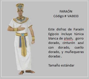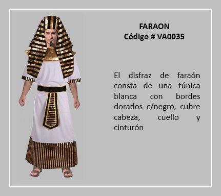 La historia de Egipto y la de los faraones están unidas y son tan complementarias entre sí; que es imposible conocer una sin la otra. En tal sentido, Faraón es la denominación bíblica dada al rey del Antiguo Egipto. Para los antiguos egipcios el primer faraón fue Narmer, denominado Menes por Manetón, quien gobernó; hacia el año 3050 a. C. Muy conocida es la historia del Tutankamón, llamado el faraón niño por la temprana edad en que asumió el trono, éste murió; cuando sólo contaba con 18 años y llevaba seis de reinado, probablemente en un motín palaciego. Tutankamón debe su fama a que su tumba fue la única sepultura del Valle de los Reyes que llegó sin saquear hasta la edad contemporanea; su descubrimiento constituyó; un acontecimiento arqueológico mundial, mostrando el esplendor y la riqueza de las tumbas reales y sacando a la luz valiosos tesoros de la época, entre los cuáles se encuentra la conocida máscara revestida de oro de Tutankamón. El último faraón fue una mujer: Cleopatra VII, de ascendencia helénica, que reinó del año 51 al 30 a. C. Los faraones fueron considerados seres casi divinos durante las primeras dinastías y eran identificados con el dios Horus. Respecto a la vestimenta, según lo indicado por varios historiadores, el llamado “sarong” era la falda de los egipcios y de esta prenda surge todo el resto, el drapeado, los cinturones; para ajustar la prenda y marcar la cintura. Por otro lado, para los egipcios era muy importante la belleza, por lo que inventaron las pelucas para lucir más altos y esta era usada como un accesorio extra. Para visualizar mejor los disfraces de este tema, desplace el indicador del mouse sobre la diapositiva y haga clic y, a continuación si lo desea en las flechas para avanzar o retroceder. Para volver al menú de la página haz clic en X ubicado en la esquina superior derecha.