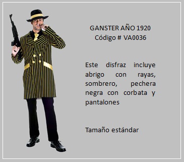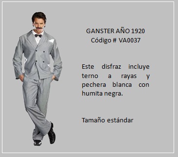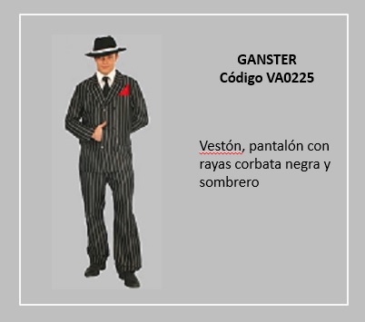 El término gánster se emplea para referirse a miembros de organizaciones mafiosas que vivieron en Estados Unidos entre los años 20 y 30 del siglo pasado. Estos se involucraban en actividades mercantiles o de negocio que, según la ley eran ilegales. Entre estas actividades se destacan el juego (casinos clandestinos) y el tráfico de alcohol durante la ley seca. Desde el punto de vista de su vestuario, el gánster de los años 20 y 30, se vestia elegantemente. Un conjunto típico incluía un traje todo negro, gris o blanco a rayas con una corbata y sombrero tipo fedora que los gánsteres los usaban comúnmente, ya fuera para que no se viera bien su rostro o por elegancia. Para visualizar los disfraces de este tema, desplace el puntero del mouse sobre las diapositivas y haga clic en ella, luego si desea visualizar otras, retroceder o avanzar con las flechas. Para volver a la página haz clic en X en la esquina superior derecha.