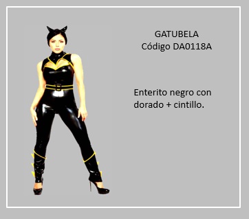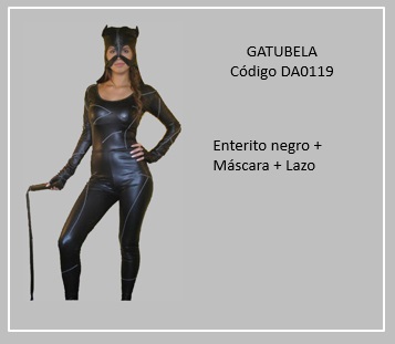 Gatúbela es el nombre alternativo en Latinoamérica de Catwoman, el famoso personaje ficticio de DC Comics. Ella es una gran atleta y tiene la agilidad propia de un gato. Utiliza un látigo como arma y es experta en combate mano a mano. La historia de Gatúbela está relacionada con la de Batman, el superhéroe también de DC Comics que se mueve en la oscuridad para hacer el bien y acabar con la criminalidad. Para visualizar el disfraz haz clic en la diapositiva y si necesita otras repite el clic en las flechas para avanzar (derecha) o retroceder (izquierda). Para volver al menú de la página haz clic en la X ubicada en la esquina superior derecha.