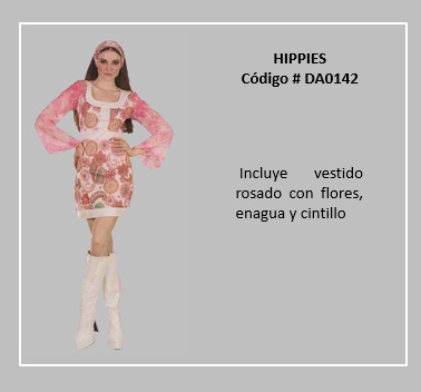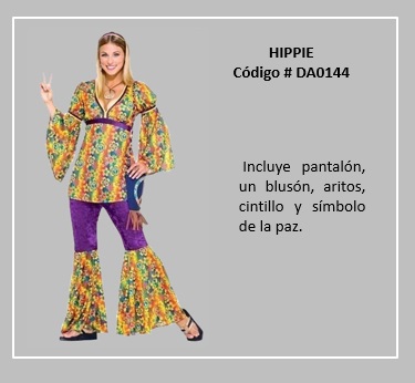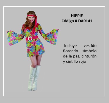 Al movimiento contracultural, libertario y pacifista, nacido en el año 1960 en Estados Unidos, así como también a los seguidores de dicho movimiento, se le llama hippie o hippy, palabra derivada del inglés hip, que quiere decir “popular, de moda”. Aunque el movimiento fue de origen estadounidense, este se expandió desde su origen californiano hacia el este del país, para alcanzar posteriormente Europa, América Latina, y Oceanía. El movimiento tuvo sus momentos importantes, en el año 1967 con el llamado verano del amor, y alcanzó su punto cúspide en el festival de Woodstock de 1969 en la costa este de EE. UU. El fin de los hippies en EE. UU. se inició a comienzos de la década de los años 1970, aunque en algunas partes del globo recién llegaba la influencia hippie. Los hippies tenían una actitud positiva, usaban una cabellera larga con cintillos, y se vestían de ropas multicolores o floreadas, se colgaban collares de flores y símbolos de la paz. Para visualizar disfraces de este tema, desplace el puntero del mouse por sobre las diapositivas y haga clic en ella, luego si desea visualizar otras, retroceder o avanzar con las flechas. Para volver al menú de la página haz clic en la X ubicada en la esquina superior derecha.