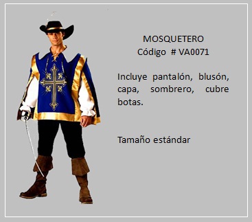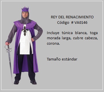 Es un periodo que se considera como un paso entre la edad antigua y la edad moderna y, como tal, comprende un cambio a nivel mundial. En este período, entre los personajes típicos están los nobles, señores feudales y el rey. Por otra parte, el Renacimiento es uno de los grandes momentos de la historia universal que marcó; el paso del mundo Medieval al mundo Moderno. Se puede decir que mientras en la era anterior la gente vivía dentro de grandes propiedades de nobles de la época llamadas feudos, y cada uno de estos tenía dentro de sus propiedades todo lo que necesitaba para ser autosuficiente, ahora se cambia este tipo de vida y comenzaron a desarrollarse las ciudades y las villas o poblaciones. Para visualizar los disfraces de este tema, haga clic en la diapositiva, luego si desea visualizar otras, retroceder o avanzar con las flechas. Para volver a la página haz clic en el signo X en la esquina superior derecha.