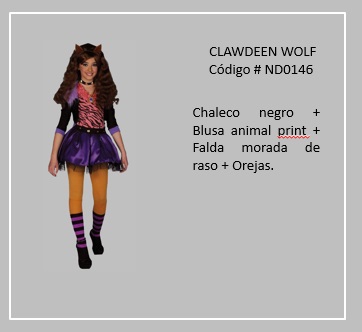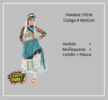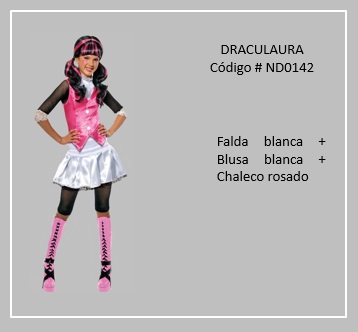 Esta es una historia de fantasía en la cual monstruos que supuestamente vivían a escondidas, incluso unos de otros, pensando que estarían en peligro si los humanos se enteraban que existían. Pero, los personajes de Draculaura, hija de Drácula, y sus monsters-amigas soñaron con un colegio donde todos eran bienvenidos y respetados. Con el firme propósito de ver su sueño hecho realidad, las monstruitas le dan la vuelta al mundo en una aventura épica para reclutar a nuevos estudiantes. Pero cómo siempre sucede en las historias hay drama: una zombi villana está decidida a crear problemas en lugar de promover la amistad, y todo estudiante vive con el temor de que su secreto será descubierto. Ahora, las monstruitas tienen que salvar su escuela para que todo monstruo tenga un lugar donde se sienta bienvenido y donde sus diferencias monstruosas sean celebradas. Para visualizar disfraces de este tema, desplaza el puntero del mouse por sobre las diapositivas y haz clic en una de ellas, luego si deseas visualizar otros trajes, retroceder o avanzar con las flechas. Para volver a la página haz clic en el signo X en la esquina superior derecha.