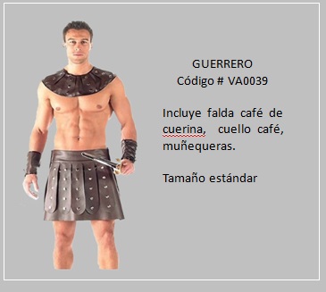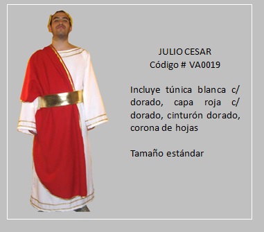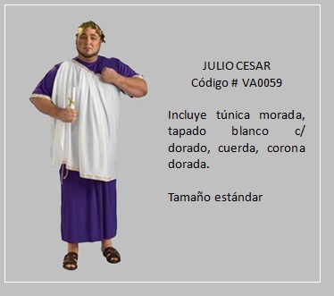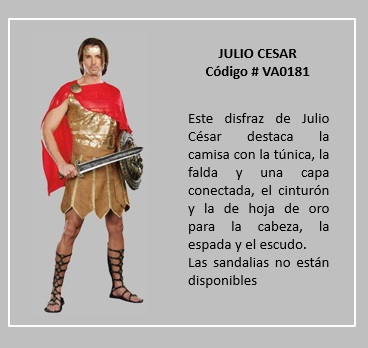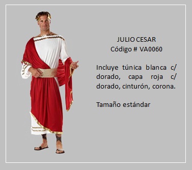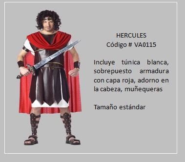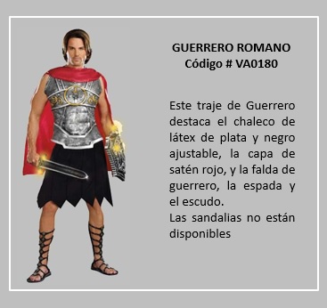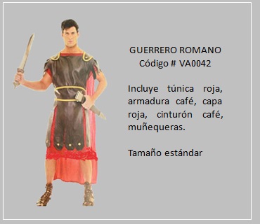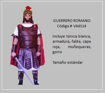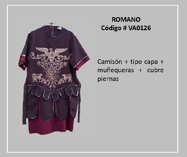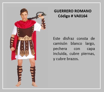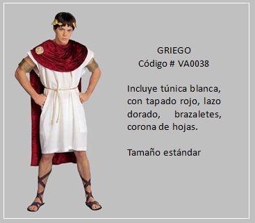 En la vestimenta usada por los antiguos romanos y griegos, tanto para hombres como mujeres, la túnica era la prenda de vestir más común. Esta consistía en un chitón, que era una túnica larga que, a veces llegaba hasta los tobillos, esta se ajustaba a la cintura con un cinturón y se prendía con broches en los hombros. La población con mayores recursos monetarios solía ponerse encima una toga, que es una tela que daban vueltas y caía en pliegues. Las joyas masculinas correspondían sólo a anillos. En cuanto a los gladiadores y soldados romanos la vestimenta tenía un fin protector, en las batallas cuerpo a cuerpo. Usaban una campestra, especie de falda doblada alrededor de las caderas. Los oficiales llevaban túnicas de guerra o dalmática, éstas llegaban hasta la media pierna, arriba de las rodillas. A estos trajes se sumaba el casco, espada y escudo, de madera pintada y decorada con bronce. La caballería usaba polainas de cuero, igual material que se usaba para el jubón, prenda de vestir ajustada que cubre el tronco del cuerpo, y las hombreras. El pecho se protegía con discos de bronce. Para ver los disfraces de este tema, desplace el puntero del mouse por sobre las diapositivas y haga clic en ella, luego si desea visualizar otras, retroceder o avanzar con las flechas. Para volver al menú de la página haz clic en la X ubicada en la esquina superior derecha.