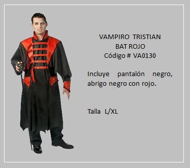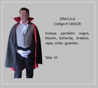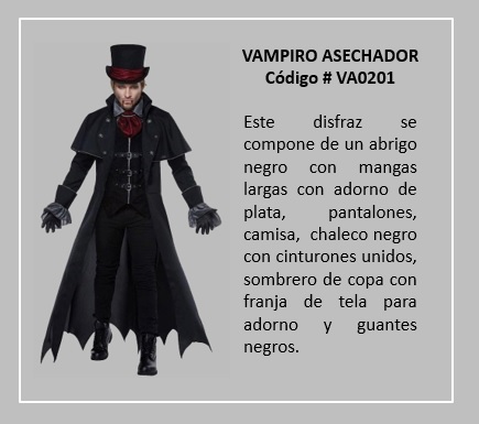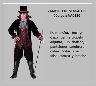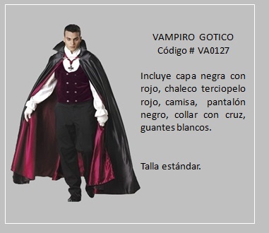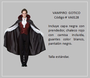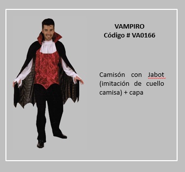 Los vampiros son unos seres de fantasía, los que según cuenta la leyenda, eran una especie de fusión entre un humano y un murciélago. La leyenda se remonta milenios atrás y, su máximo apogeo se produjo entre los siglos XV y XVI en Europa, principalmente en Rumania y Hungría. De hecho, Transilvania, región central de Rumania, es señalada como la cuna de los vampiros y donde pasó gran parte de su vida el más famoso de todos ellos; el conde Drácula. Los vampiros parecen ser los seres más adaptados en la historia del cine y se han ido transformando según la moda, los gustos personales y las ideas de aquellos que los han llevado al estrellato. El traje que un vampiro vestía es un traje muy similar al de las personas ricas en la época final del siglo XIX, es decir, llevaban una camisa elegante, una humita, una chaqueta negra, una capa, unos zapatos bien lustrados y unos pantalones elegantes. En el caso de los vampiros son afines la ropa de color negra y accesorios rojos, por el tema de la asociación de la oscuridad y la sangre para alimentarse. Para visualizar los disfraces de este tema, haga clic en la diapositiva, luego si desea visualizar otras, retroceder o avanzar con las flechas. Para volver a la página haz clic en el signo X en la esquina superior derecha.