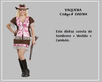 Las llamadas vaqueras son las representantes femeninas de los cowboys que heredaron su oficio de los vaqueros mexicanos que habitaban el suroeste y oeste de EE.UU, desde Texas a California. Su labor era muy importante, en especial, por la necesidad de transporte del ganado desde Texas hacia el norte del territorio, desde donde era luego distribuido. Esta labor necesitaba jinetes diestros y resistentes que garantizasen el traslado del rebaño. Los cowboys o vaqueros eran un verdadero brazo armado al servicio de los grandes ganaderos, los cuales se quedaban con la mayor parte de las ganancias. Eran personas muy heterogéneas, pues entre ellos había antiguos soldados, afroestadounidenses, mexicanos, etc.; en su mayor parte eran jóvenes y sin una preparación escolar.  Para visualizar los disfraces de este tema, haga clic en la diapositiva, luego si desea visualizar otras, retroceder o avanzar con las flechas. Para volver a la página haz clic en el signo X en la esquina superior derecha.
